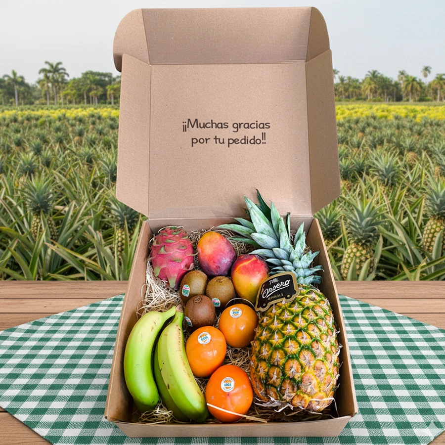 Contenido: 1 Piña, 2 mangos, 4 plátanos, 3 Kiwis, 3 Kakis, 1 Pitaya.